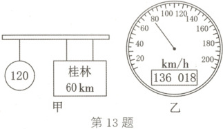 13.(1)图甲中的“120”是限速标志,表示汽车的最快速度不能超过120 km/h;“桂林60 km”表示距离桂林还有60 km的路程 (2)从图甲的标志牌处到桂林至少需要的时间$t = \frac{s}{v} =$ $\frac{60 \mathrm{km}}{120 \mathrm{km/h}} = 0.5 \mathrm{h}$ (3)图乙所示的速度为80 km/h,则若以图乙所示的速度行驶1.5 h,通过的路程$s' = v't' = 80 \mathrm{km/h} × 1.5 \mathrm{h} = 120 \mathrm{km}$