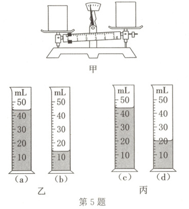 (2) 重新把放有烧杯的天平调到水平平衡之后,在量筒中倒入适量的水。如图乙(a)所示,把水倒一部分到天平的左盘内的烧杯中,剩余的水如图乙(b)所示;用另一干燥的量筒装入液体,如图丙(c)所示,把该液体倒入右边的烧杯中,直到