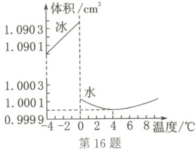 16. (2024·太原晋源期末)小华将 $ 1 \, g $ 的冰从 $ -4 \, ℃ $ 开始加热,并记录其温度和体积的数据,利用描点法得到了如图所示的图像。不考虑水的汽化,则下列说法中正确的是(