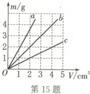 15. 通过实验,得到了 $ a $、$ b $、$ c $ 三个实心体的 $ m-V $ 图像如图所示,分析图像可知(