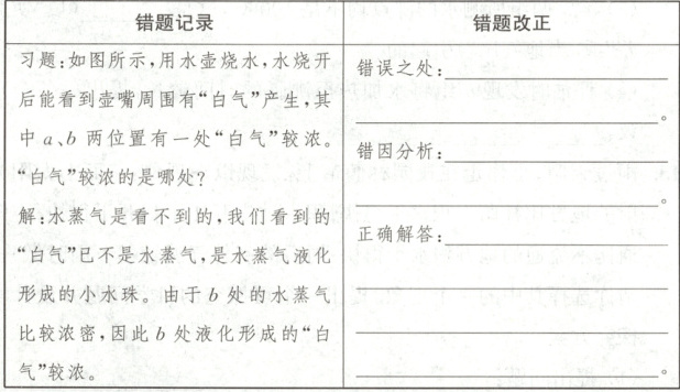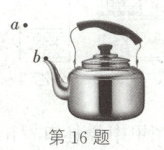 16.由于b处的水蒸气比较浓密,因此b处液化形成的“白气”较浓 液化是温度较高的水蒸气遇冷形成的,壶嘴处温度较高,因此不会发生液化现象,也就不会出现“白气”,应该a处较浓 壶嘴处温度较高,水蒸气不会发生液化现象,也就不会出现“白气”,a处温度接近室温,相对从壶嘴中出来的水蒸气温度较低,水蒸气易液化,所以a处较浓