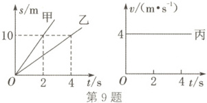 9. (2024·吕梁汾阳期中)甲、乙、丙三辆小车同时、同地向同一方向运动,它们运动的图像如图所示,下列说法正确的是(