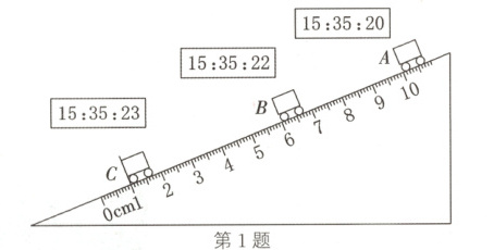 1. (2024·太原小店校级段考)小明在“测小车的平均速度”的实验中,设计了如图所示的实验装置:小车从带刻度(分度值为1mm)的斜面顶端由静止下滑,图中的矩形框是小车到达A、B、C三处时电子表的显示(数字分别表示“小时:分:秒”)。