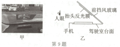 9. “抬头反光膜”是一块镀膜半透明有机玻璃,张贴在汽车的前挡风玻璃内表面,既可以反光,也可以透光。如图所示,当将手机放于驾驶台的适当位置,“抬头反光膜”将手机屏幕的画面反射到驾驶员前方。下列说法正确的是(