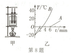 8. 如图甲所示,将质量相等的冰和烛蜡分别装在两支相同的试管中,放入装有水的烧杯中加热。绘制出温度随时间变化的图像如图乙所示。下列说法正确的是(
