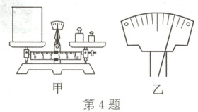 4. 小明想用天平称出20g水,先用正确的方法测出空烧杯的质量,如图甲所示。然后在右盘中增加20g砝码,接着向烧杯中注入一定量的水,指针位置如图乙所示。接下来的操作应该是(