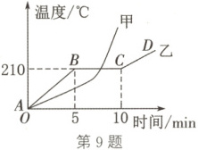 9. (2024·晋中榆次期中)在某次科学试验中,实验人员对甲、乙两高分子固体材料绘制了如图所示熔化时温度随时间的变化图像。学习小组对该图像进行了解释,下列说法正确的是(