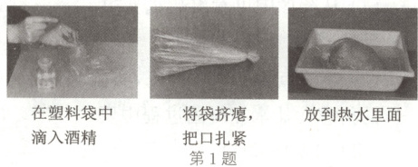 1. 如图所示,在透明塑料袋中滴入几滴酒精,将袋挤瘪,排尽空气后用绳把口扎紧,然后放入80℃以上的热水中。看到热水里的塑料袋鼓起来,表明其中的液态酒精受热后变成了