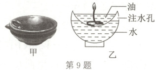 9. (跨学科实践·工程实践)(2024·北京)图甲为我国古代的“省油灯”,图乙为其部分剖面示意图。向灯盏夹层内注水,有助于减慢油的蒸发,达到省油的目的。关于“省油灯”减慢油蒸发的方法,下列说法正确的是(