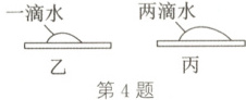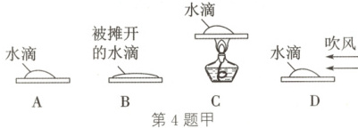 4. 在探究影响液体蒸发快慢的因素时,小华猜想液体蒸发快慢可能与液体温度的高低、液体表面空气流动快慢、液体表面积大小有关。为了验证以上猜想,小华在相同的四块玻璃板上各滴一滴质量相同的水滴,进行如图甲所示的实验探究。
