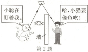2. 如图所示为关于小猫和小聪的一幅漫画,图中两条光线的夹角是60°,则小聪观察小猫的光路的入射角是