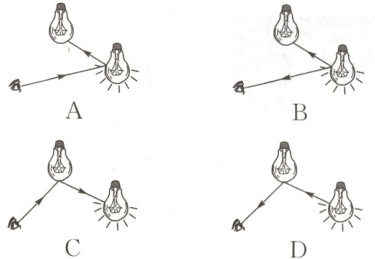 8. 黑暗的房间里有两盏灯,只有一盏灯点亮,但人能看到未点亮的灯,下列对于“看到未点亮的灯”所画的光路图,正确的是(