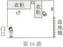 16. 小明站在储藏室的门口找东西,房间里有一面落地镜、两个高大且不透明的衣柜,布局如图所示。如果他不改变自己的位置,房间里的橡皮鸭、足球、耳机、手套这四件东西中,他可以看到的件数是(