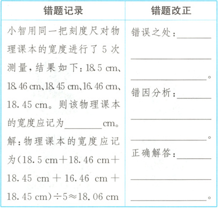 15.18.5 cm、16.46 cm 没有估读到分度值的下一位、准确值与其他数据不同 物理课本的宽度应记为$\frac{18.46 cm + 18.45 cm + 18.45 cm}{3} ≈18.45 cm$