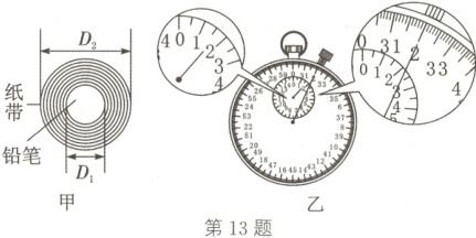 13. 将薄厚均匀的纸带紧密环绕在圆柱形铅笔上$n$圈,纸带的内径为$D_{1}$,外径为$D_{2}$,如图甲所示,纸带的厚度为