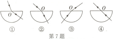 7. 如图是光从空气射入半圆形玻璃砖,再由玻璃砖射入空气的光路图,O点是半圆形玻璃砖的圆心。下列光路图正确的是(