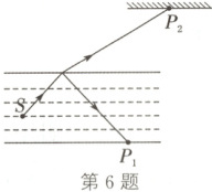 6. 如图所示,游泳池中的水面下方的光源S发出的一束光线经水面反射后在池底产生光斑P₁,折射光线在天花板上产生光斑P₂。若水面下降一小段距离,则(