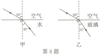 8. 小明探究“光的折射规律”时,做了两个实验,如图所示。对比甲、乙两图,你有什么发现?