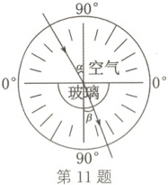 11. 如图所示为某同学利用光具盘探究光从空气斜射入玻璃中时的光路,经过多次实验并记录了如表所示的数据。