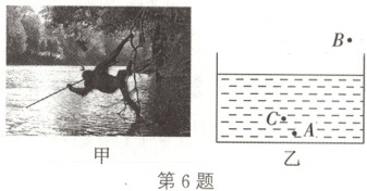 6. (2024·山西模拟)如图甲所示为人类首次拍到猩猩使用工具捕猎的情景。为了捉到一条鱼,猩猩用矛拼命地刺向水里却没有成功。请在图乙中画出猩猩眼睛在B处看到河底鱼的光路图,其中A、C分别是鱼和鱼的像所在位置。