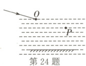 24. (2024·泰安新泰模拟)如图所示,水下有一块平面镜,一束光射入水中,再经水中的平面镜反射后恰过P点,请将光路图补充完整(保留作图痕迹)。