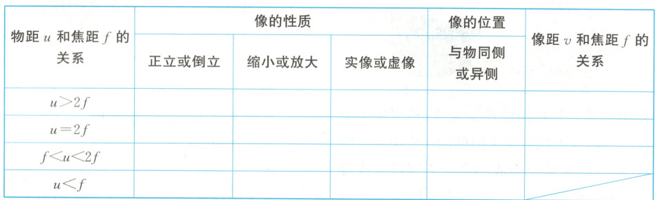 2. (从左往右,从上往下)倒立 缩小 实 异侧 f<v<2f 倒立 等大 实像 异侧 v=2f 倒立 放大 实像 异侧 v>2f 正立 放大 虚像 同侧