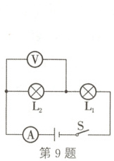 9. 如图所示的电路,闭合开关后两灯均不发光且电流表、电压表示数均为零。现将两灯泡位置互换后再次闭合开关,电流表示数仍为零,电压表指针明显偏转。根据以上信息判断该电路故障可能是(
