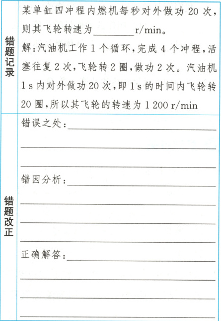 11.做功2次;1s的时间内飞轮转20圈,所以其飞轮的转速为1200r/min 汽油机工作1个循环做功1次,一个循环中做功次数与飞轮所转圈数、活塞往复运动次数混淆 1个工作循环中包括4个冲程,飞轮转2圈并对外做功