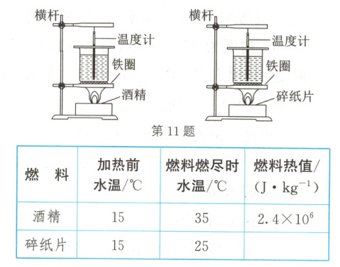 11. 小明选用相同质量的酒精和碎纸片加热等质量的水,来测量酒精和碎纸片的热值大小,如图所示,记录的数据如表所示。另一组同学用同样的装置进行实验,但在两种燃料燃尽之前水就都沸腾了,小明认为这样无法测量出两种燃料的热值,并提出了改进建议。请回答下列问题。