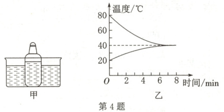 4. (2024·大同平城段考)如图甲所示,小明将质量为$300g$、初温为$80^{\circ}C$的牛奶放入质量为$500g$、初温为$20^{\circ}C$的水中进行冷却,同时,他还利用温度计和秒表测量两者温度的变化情况,并作出了如图乙所示的水和牛奶的温度随时间变化的关系曲线。忽略热量的损失以及盛牛奶和水的器皿吸收热的影响,$c_{水}=4.2×10^{3}J/(kg·^{\circ}C)$。求: