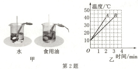 2. (2024·吕梁孝义段考)如图甲所示为探究“比较不同物质的吸热能力”的实验装置。图甲中使用相同规格的电加热器分别对质量相等的水和食用油加热,得到温度随时间变化的图像如图乙所示。下列说法正确的是(