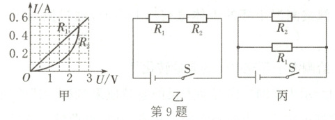9. 如图甲所示是电阻$R_{1}$和$R_{2}$的$I - U$图像,下列说法正确的是(