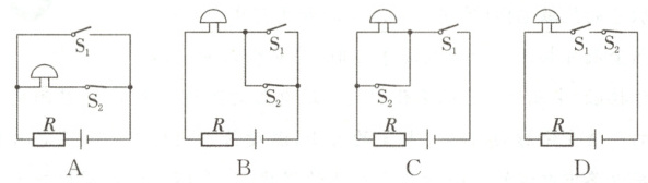 7. 立定跳远是我省中考体育测试项目之一。项目化小组的同学想设置一种装置来监测过线犯规的现象,当有同学踏上测试垫时,开关$S_{1}$、$S_{2}$同时闭合,当机器感应到脚尖过线时,红外感应开关$S_{2}$断开,电铃发出声音提醒裁判该考生犯规。下列选项中,符合监测装置工作原理的是(