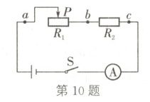 10. 在如图所示的电路中,电源电压保持不变。若在电路中再接入一个电压表,且当滑片$P$分别位于变阻器的左端、中点和右端时,电压表的示数如表所示,下列说法正确的是(