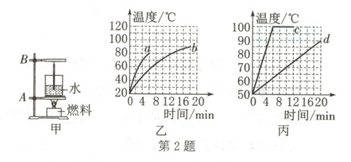 (3)小明选用燃料 $a$ 和燃料 $b$ 进行实验,当燃料燃尽时,小明记下了各个时刻的水温,绘制了如图乙所示的图像,则可初步判断燃料