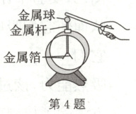 4. (2023·自贡)如图所示,用毛皮摩擦过的橡胶棒接触验电器的金属球,验电器的两片金属箔张开一定的角度。两片金属箔张开是因为在这个过程中