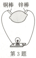 3. 如图所示,小芳自制了一个柠檬电池,她把一个小灯泡接入电路时,发现小灯泡发出了微弱的光,则下列说法中错误的是(