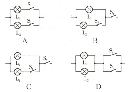 12. 老师给小龙一个密封盒,其表面可见两个开关S₁、S₂和两盏灯L₁、L₂。为了探究开关和灯在密封盒内是如何连接的,小龙进行了如下操作:先闭合S₁,只有灯L₁发光;又闭合S₂,两灯都发光;再断开S₁,两灯都熄灭。符合上述实验结果的连接方式为(