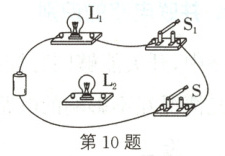 10. 如图所示,要使两灯并联,S是总开关,S₁只控制灯泡L₁,请将所缺的导线补上。