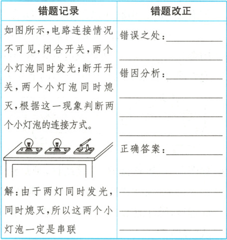 9.错误之处:两灯一定是串联 错因分析:该同学的错误原因在于忽略并联电路中开关在干路上,也能控制整个电路的通、断 正确答案:若两灯并联,开关接在干路上,也能实现“闭合开关,两个小灯泡同时发光;断开开关,两个小灯泡同时熄灭”,所以两灯的连接方式有两种可能:一是串联;二是并联且开关接在干路上