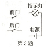 3. (2024·太原期中)为了方便游客参观,某展馆需要设计一个门禁电路,要求:前、后两门各装配一个开关,若任意一个开关闭合,则指示灯亮,表示休馆;若前、后门开关都断开,则指示灯熄灭,表示馆在开放中。根据要求在图中补全电路图。