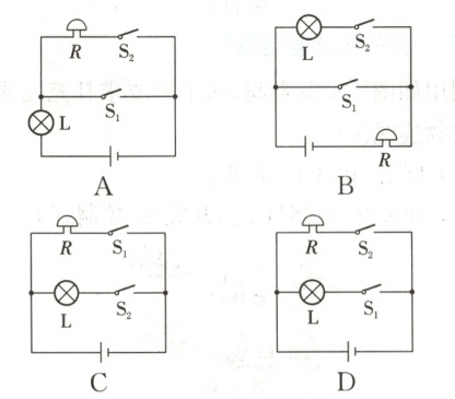6. 宾馆房间有门铃系统,当房客闭合开关 $ S_{1} $,“请勿打扰”灯泡 $ L $ 发光,来访者即便闭合门铃开关 $ S_{2} $,门铃 $ R $ 也不发声;只有在 $ S_{1} $ 断开,$ S_{2} $ 闭合时,门铃才发出“叮咚”声。下列图中设计的电路图,跟该门铃系统功能吻合的是 (