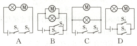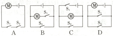 2. (2024·太原迎泽校级段考)学校科技室新进了一批设备,两把钥匙(可视为开关 $ S_{1} $、$ S_{2} $)同时使用,才能打开设备(可视为电动机开始工作)。为了显示设备是否工作,该设备工作时指示灯要亮,因为指示灯容易被烧坏,所以指示灯烧坏后不能影响设备的正常工作。你认为下列电路图符合设计要求的是 (