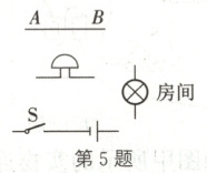 5. (2024·临汾侯马期中)“创新”实验小组的同学要设计一个自动防盗报警电路。要求:晚间开关 $ S $ 闭合后,灯亮电铃不响;当房门被打开时,细导线 $ AB $ 被扯断,灯亮且电铃发声自动报警。请按要求用笔画线代替导线连接如图所示的电路元件。