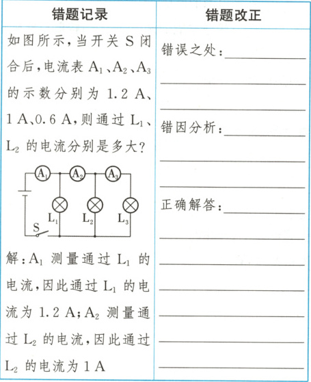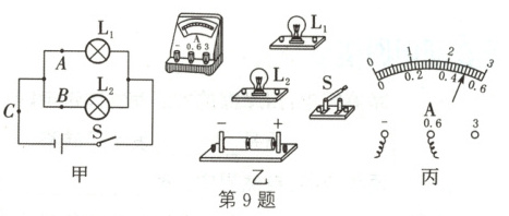 8.A1测量通过L1的电流,A2测量通过L2的电流,电流表测量对象分析错误,A1测量L1、L2、L3并联后的总电流;A2测量L2、L3并联后的总电流;A3测量L3的电流;通过L2的电流I2=1A−0.6A=0.4A;通过L1的电流I1=1.2A−1A=0.2A