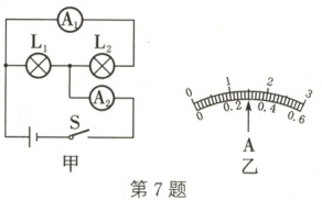 7. (2024·吕梁孝义段考)如图甲所示,闭合开关,两灯泡均正常发光,且两个完全相同的电流表指针偏转均如图乙所示,通过灯泡L₁和L₂的电流分别为(