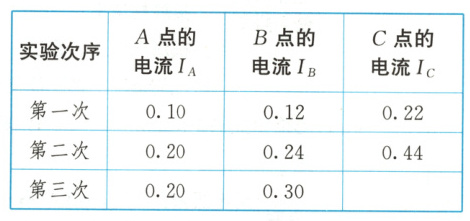 (3)小组同学把电流表分别接到电路中的A、B、C点,将第一次测出的电流填入下表。为了减小偶然因素的影响,他们采用了以下两种方法来重复实验,并将相关数据记录在下表中。