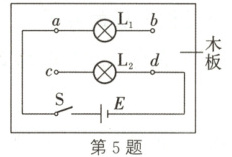 5. (2024·太原小店校级段考)小华无意中在家里储藏间发现了一个安装在木板上的电路,闭合开关后,两灯都能发光。如图所示为木板正面的部分电路,其中 $ a $、$ b $、$ c $、$ d $ 是穿越木板的接线柱,两个灯座的两端分别接在两个接线柱上,安装两个相同规格的小灯泡 $ L_1 $、$ L_2 $,木板背面的部分接线柱间有导线相连着,从而使木板正背两面的电路组成一个完整的电路。请你设计一个实验方案判断两灯泡是串联还是并联的。
