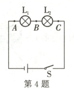 4. 如图,在“探究串联电路中电压的规律”时,小雨同学用电压表测出 AB、BC、AC 两端的电压分别为$ U_{AB}=3 V,$$U_{BC}=3 V,$$U_{AC}=6 V,$在表格中记录数据后,下一步应该做的是(
