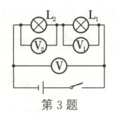 3. (2023·怀化)在如图所示电路中,闭合开关后电压表 V₁ 的示数为 2.5 V,电压表 V 的示数为 4.5 V,则电路的电源电压为